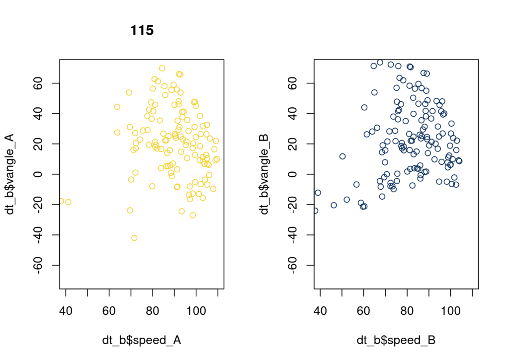 plot(dt_b$speed_A, dt_b$vangle_A, xlim = c(40, 110), ylim = c(-70, 70), main = as.character(115), col = "#F5D130");