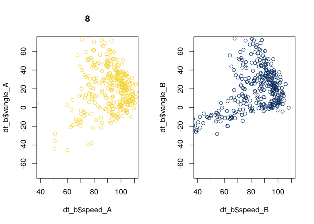 plot(dt_b$speed_A, dt_b$vangle_A, xlim = c(40, 110), ylim = c(-70, 70), main = as.character(8), col = "#F5D130");
