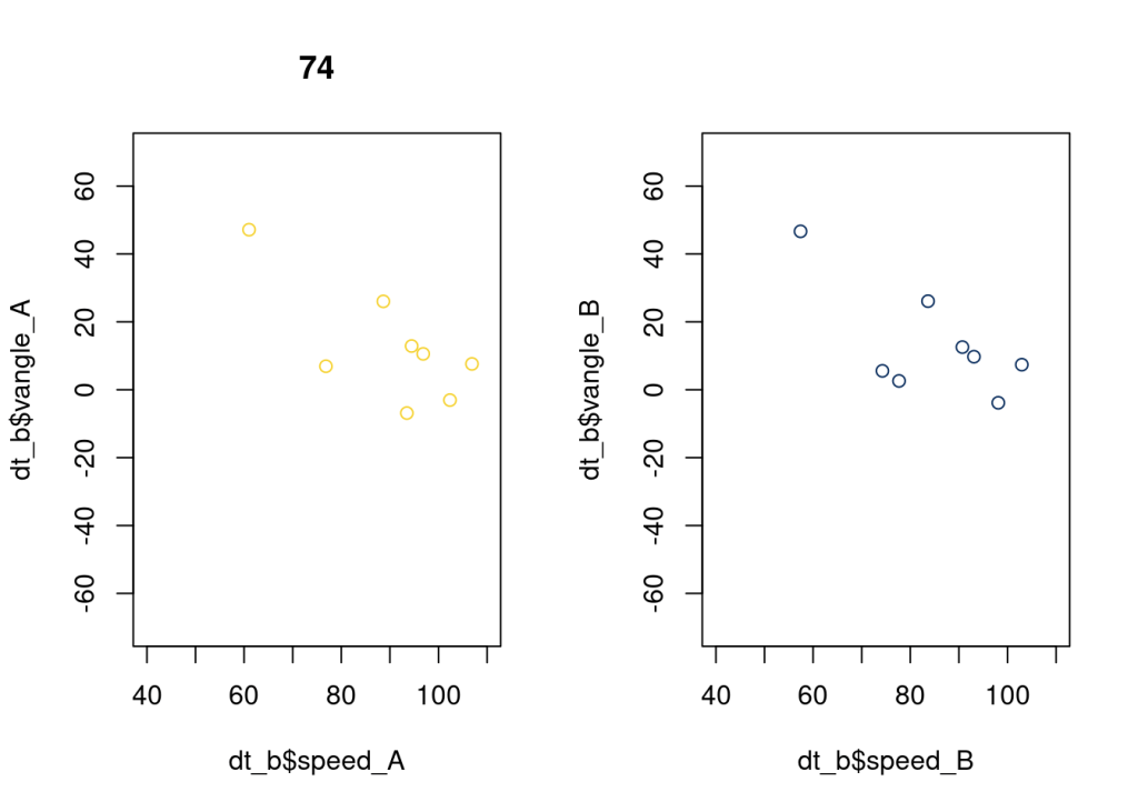 plot(dt_b$speed_A, dt_b$vangle_A, xlim = c(40, 110), ylim = c(-70, 70), main = as.character(74), col = "#F5D130");