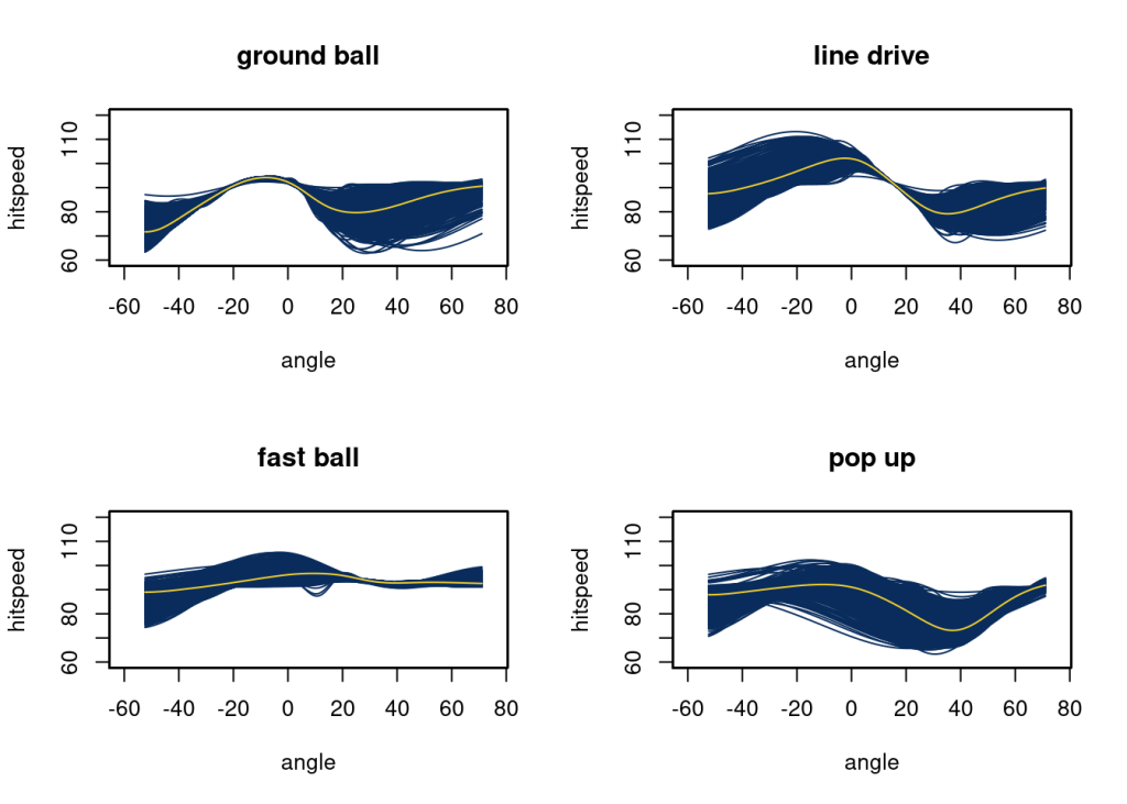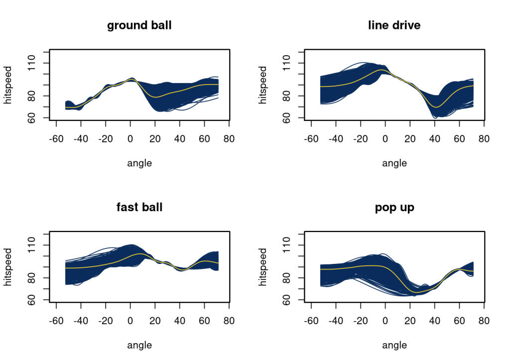 Here, as expected, we get more complex functions as the dataset grows. Ground balls now have a more steadily increasing speed from -40 to 0 degrees. The speed off bat of a line drive decreased quickly at higher angles. Fast balls are similar at all angles. Speed off bat for popups drops off after 0 and returns to about 90 at an angle of 60.